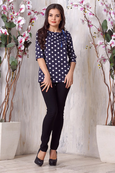 Стильная блузка темно синего цвета с принтом в крупный горох. Модель свободного кроя, удлиненная, с рукавами 2/4 и горловиной, собранной на кулиску с атласной ленточкой.